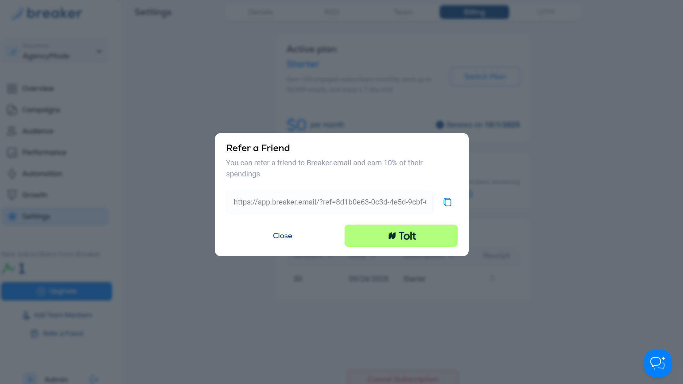 When you register on Tolt to withdrawl funds make sure you use the same email as you do to login to Breaker.